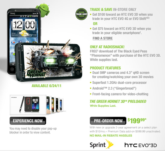Pre-order Sprint’s HTC EVO 3D from RadioShack and get extra content for free
