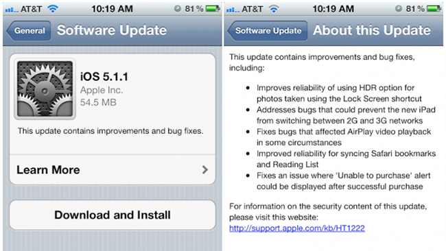 Apple released iOS 5.1.1 for the iPhone, iPod touch and iPad this afternoon. The 40-50 MB download appears to be a minor release with a handful of bug fixes, including improved reliability for taking HDR photos from the lock screen, improvements in the  iPad’s ability to switch from 2G to 3G networks, bug fixes for AirPlay video playback, more reliable Safari bookmarks and Reading List syncing, and a fix for an unusual “Unable to Purchase” alert that appears after a successful transaction.