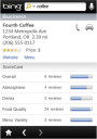 The Bing iPhone app serves up a homepage image whenever you launch the app. Tapping the homescreen hides the navigation controls and replaces them with gray boxes that, when tapped, offer up interesting tidbits of information related to the image. The image search feature splashes the daily image on the screen and offers up related images as thumbnails. Movie search automatically keys in on your locations and list all the movies playing in your area, complete with movie ratings. The news search feature is fairly straightforward, but probably won’t be replacing Google News anytime soon. You can search or browse nearby businesses with the business search feature, and then get directions to the business with a tap of the “directions” tab.