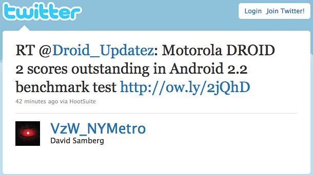 Perhaps best of all is the fact that the tweet links to reports of our own exclusive where we showed you the impressive Droid 2 benchmark tests. The device will be launching with Android 2.2, or Froyo, and it looks like it improves nearly everything you could have wanted to improve with the original Droid.
