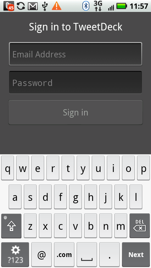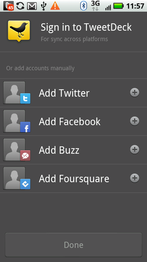 The first thing you’ll notice is that the initial start-up screen asks you to add Twitter, Facebook, Foursquare, and Buzz accounts. You can do so manually or you can just sign into your TweetDeck account and have the app automagically sync your accounts. As long as you’ve setup your TweetDeck account through the desktop application/client, all you have to do is log in to your TD account in the Android app and watch as it automatically verifies all your social networking profiles.