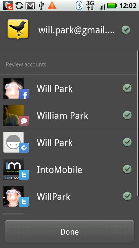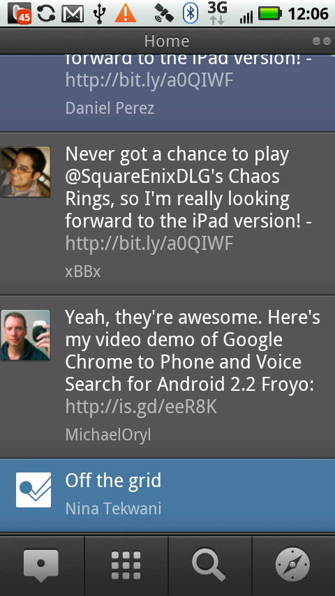 Next, you’ll notice that, rather than serve up a separate column/pane for every single social network, TweetDeck for Android puts all your public timeline updates into a single feed. You get Twitter, Facebook, Buzz and Foursquare updates in a convenient in-line stream. This will either be really annoying or really helpful to you, depending on how many friends you have across your various networks. Check out the video to see how the Android app’s user interface compares with the desktop and iPhone/iPad apps.