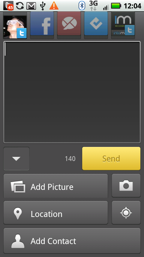 The status update tool is one of the coolest aspects of the app. Hit the little “message bubble” button in the lower left hand corner and you are taken to your status update screen. From here, you can toggle the different social networks that you’d like your latest update message to post to. It’s dead simple and very useful. It’s also easy to add an image from your phone’s image gallery, insert a pic by taking a new photo with the camera, add a nearby location, tag the update with your current location, or add a contact to the message.