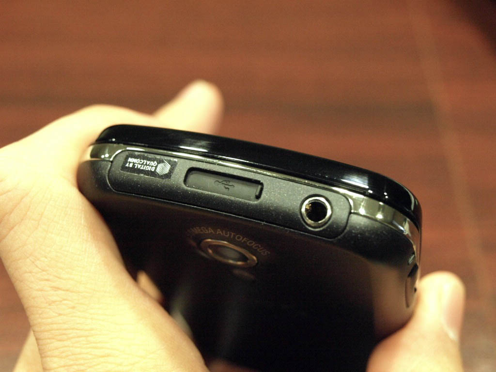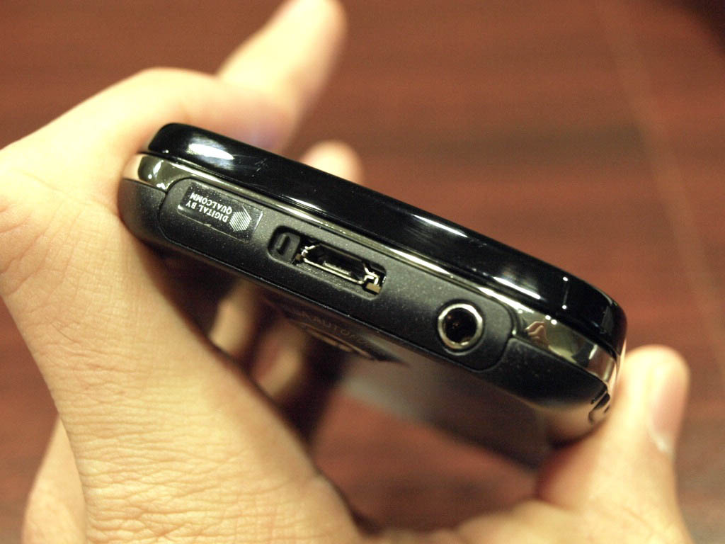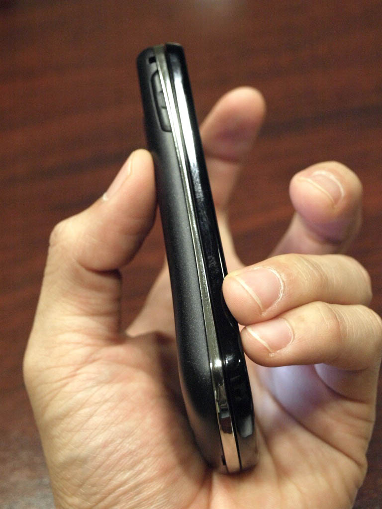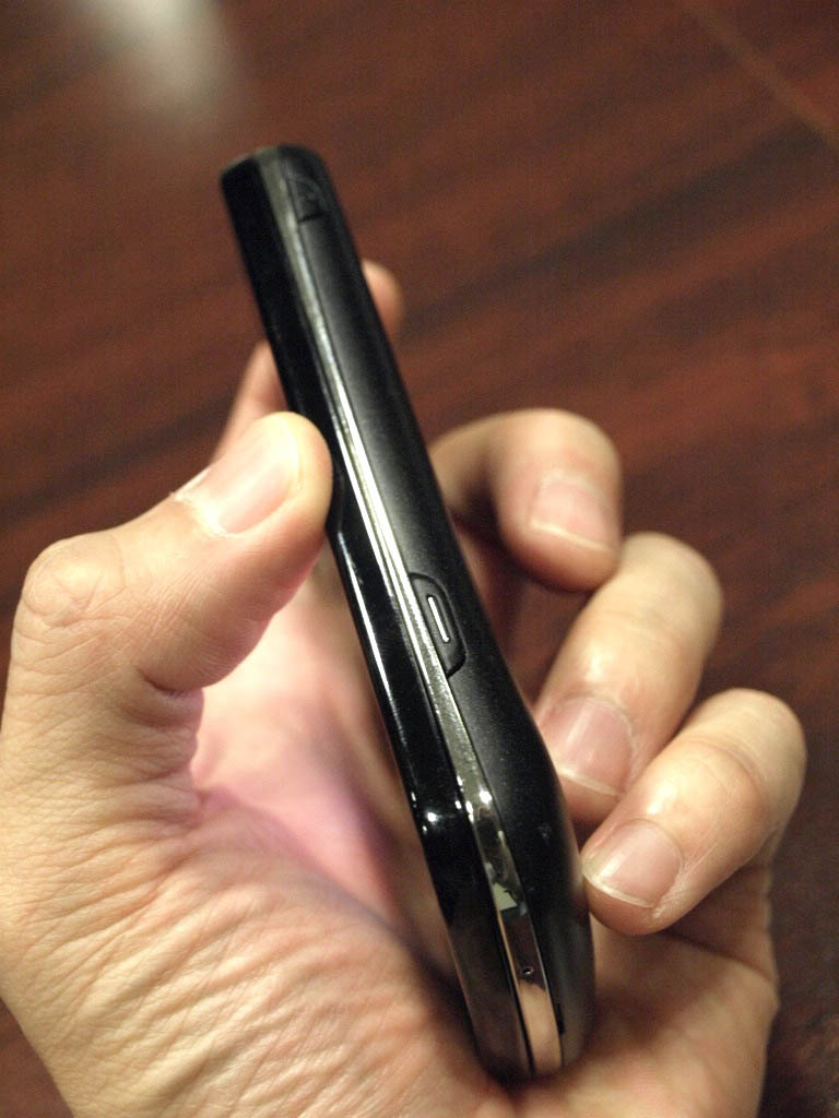 The glossy black face is trimmed in a glossy black bezel, giving the handset a sleek aesthetic. But, Sprint has customized the Galaxy S Pro with a dash of pizazz by adding a metallic/chrome ring around the keyboard. The Epic 4G isn’t all glossy black plastic and metallic trim, though. The backside is coated in a slightly sparkly, matte-black finish. Sparkles and matte black don’t usually go together, we know, but trust us on this one (or just take a gander at the pics). It’s a soft-touch finish, which gives the phone a secure in-hand feel.
