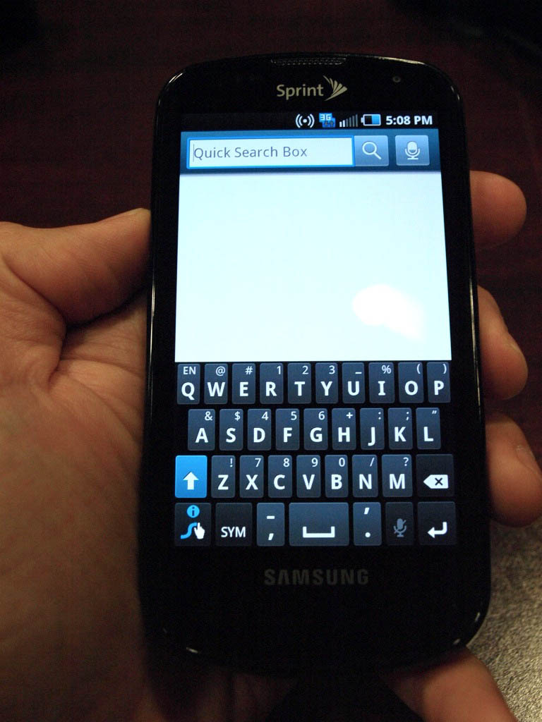 A hands-on look at the Sprint Samsung Epic 4G, which is Sprint's variant of the Galaxy S ProIf you can manage to ignore the scent of the curing resins and brand new plastic – telltale scents of a new gadget – you’ll probably start tapping away at the keyboard. What you’ll notice is that the keyboard keys are really flat, with no contouring whatsoever. That might sound like a bad thing, and to some it might be, but the size of the keys and the spacing between the keys make for a good typing experience. We’d have liked to have seen some more texture on the keys, but it probably won’t be too hard to become proficient enough to start touch-typing (without looking at the keys). Again, the spaces between keys provide good tactile feedback. And, speaking of tactile feedback, the keys give enough resistance to prevent typos, but give way to a meaningful finger press with a muted “click.”