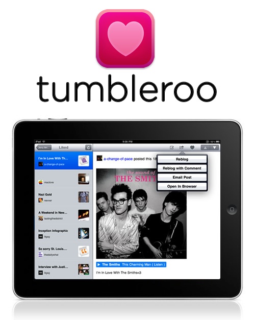 Tumblr, the online service that’s not quite a blog, but not quite a microblog like Twitter, now has a beautiful way of being accessed on the iPad via an application called Tumbleroo. Developed by Jerry Brito and Peter Snyder, Tumbleroo introduces a dual pane user interface that lets you do all the things you usually do with your Tumblr: reblog, reblog with comment, or share.
