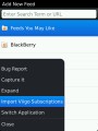 News Feeds lets you import any feeds you may have had with your old Viigo account, subscribe to feeds in already-populated categories (including what looks like a dynamically-generated suggestions category), share news items via social networks and messaging, and set push alerts within your Messages application for when particular feeds are updated. News Feeds uses the BlackBerry ID system introduced in App World 2.0, so presumably you’ll be able to get all of your feeds from the cloud whenever you switch BlackBerrys. If you’re having trouble finding feeds to add, you can always just enter a search term and see what pops up, or if you know exactly what you want, put in a site’s RSS address to subscribe to the feed right away. I suspect that there will be some tie-in with the native browser so that if you’re looking at a site and want to keep tabs on it regularly, the “Add Feed” option in the menu launches the News Feed app