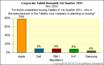 ChangeWave released results of its November survey which it conducted among 1,641 business IT buyers to give us a close-up look at first quarter corporate tablet demand. Overall the results are positive, with 7% of respondents saying their company provides employees with tablet devices — up 1-pt since the previous survey in August. Unsurprisingly, the…