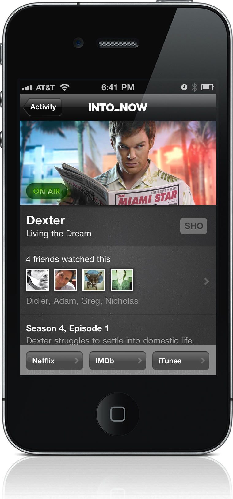 Then, once you’ve tagged a show, you can do a few cool things with that info. You can find out more information about a show (season, episode, description. You can tap a link to find out even more info at IMDB. If available, you can add the show to your Netflix Instant Watch Queue. And, you can even buy the show on iTunes. On the social side of things, you can share your thoughts about that show via Facebook or Twitter or the IntoNow app itself. You can check out what your friends are watching and which shows they’ve already watched. You can even find out which shows you and your friend have both watched.