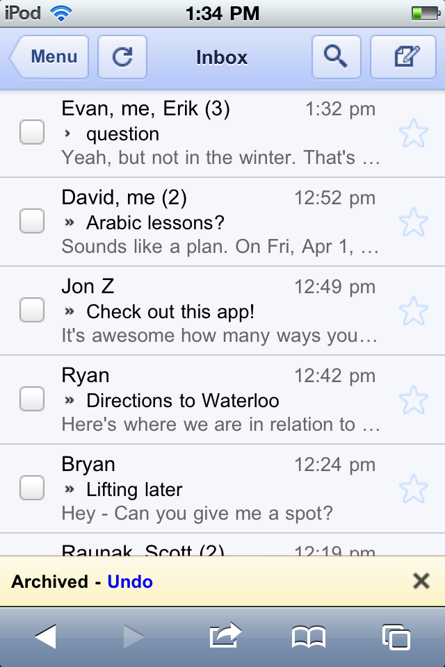 Now when you use the Gmail mobile web app, you’ll have a small window of opportunity to undo four key actions: archive, delete, add or remove a label, or move a message/conversation.