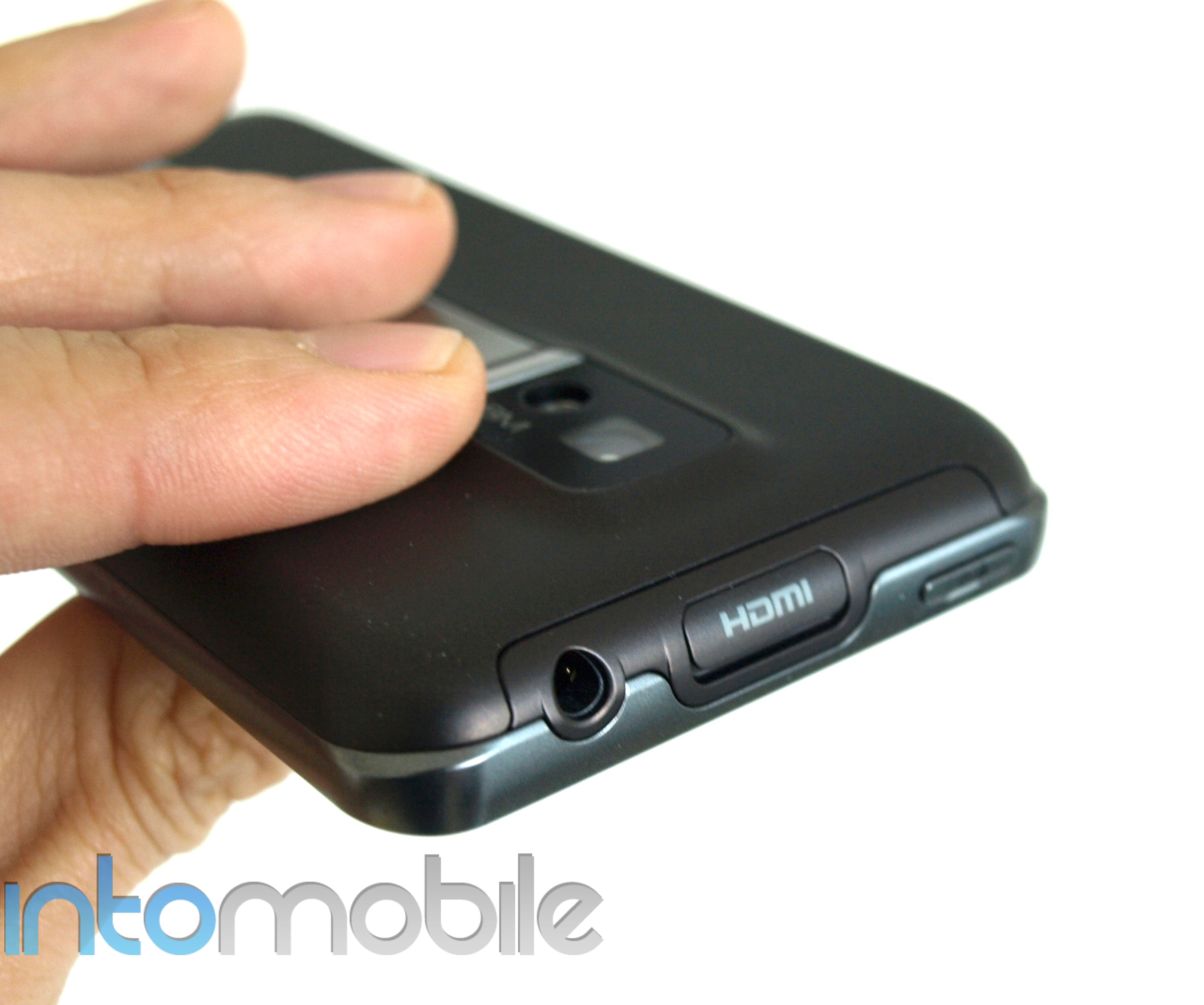 The top of the handset houses the 3.5 mm headphone jack, the power/lock button, with the micro HDMI port in the middle of the two. The port is covered by a small tab you can pull out, which gets the job done, but we were hoping to see a more elegant implementation, like the Galaxy S line’s sliding cover. Going over to the right side of the handset will show you two separate volume keys, which feel good when pressed, giving the perfect amount of tactile feedback. The left side of the G2x is clean, with the bottom housing the charging port and stereo speakers.