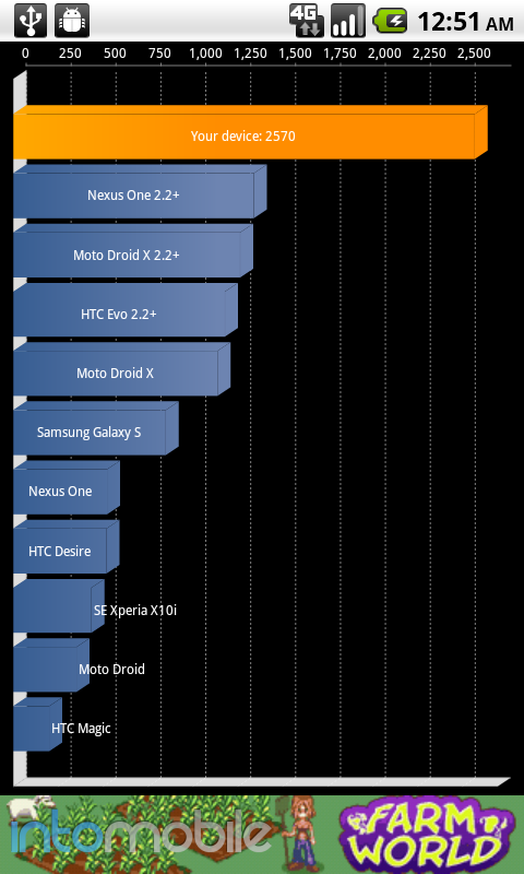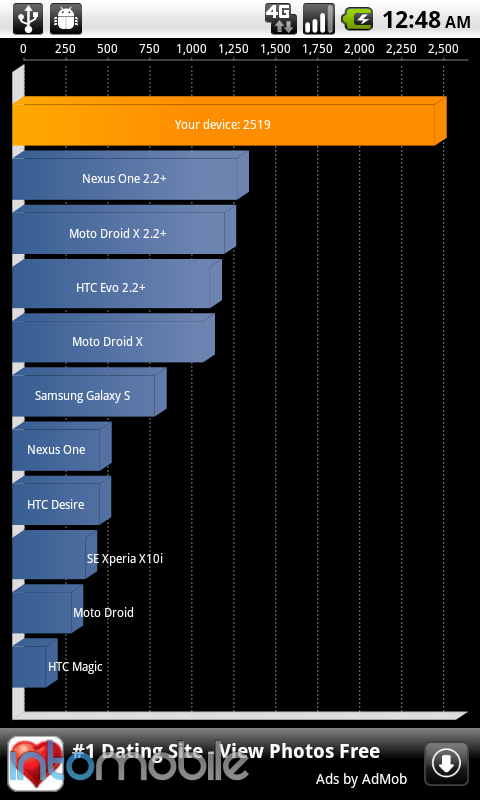 So while the Atrix may have similar innards as the G2x, T-Mobile’s handset beat the Atrix out in every category, even if by a small amount. What’s surprising, though, is that the graphics benchmark was significantly lower, which is a bit strange given they both share the same CPU. This is likely due to the fact that the Atrix 4G’s display has a much higher resolution. While numbers aren’t everything, having the G2x push out 24 frames per second more than the Atrix only furthers our belief that if you’re looking for a Tegra 2 smartphone today, the G2x should be the one to go to. Maybe Motoblur is sucking the life out of the Atrix?