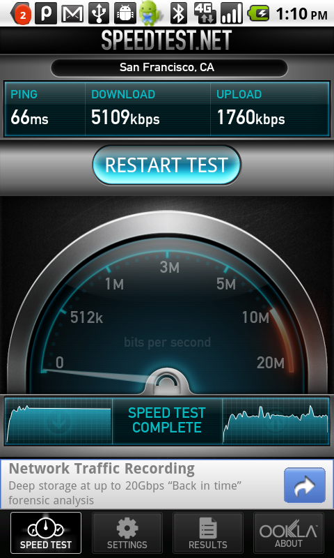 The handset supports T-Mobile’s “4G” HSPA+ network, and can deliver some great speeds. That said, your coverage will vary depending on how close you are to a tower. Even with full bars where I live, the G2x struggled to get past 1.5MBps. When going about 15 blocks towards downtown, the handset began to see an average of 5.4 MBps, with peaks up to 6.4. Upload speeds were decent, but nowhere near as impressive compared to download speeds, averaging just below 1MBps.