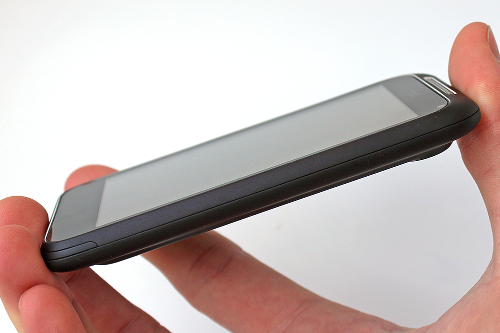 The HTC Incredible S maintains a pocketable 12 mm profile, while still offering a good-sized 4-inch screen. The unibody design gives it a decidedly solid feeling, and the soft finish makes it easy to slip into your hand. The style lines up nicely with the precedent HTC has set, which means a lot of smooth lines, and a few crisp, glinting accents. The capacitive buttons beneath the screen are seamless, and have a neat trick: when you rotate the phone, they rotate with you (but only when you flip it onto the left side). The rear battery door design has a cool tech-y feel to it, though not particularly necessary or ergonomic. In terms of feel, the matte finish didn’t have quite as much grip as I would have liked, but it did make holding the phone a soft and smooth experience.