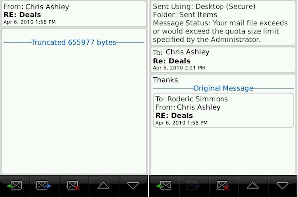 All e-mails sent on a BlackBerry get pumped through RIM’s servers in Waterloo for compression, and though it seems roundabout and results in weird limits like these truncated e-mails, it does mean carriers can dish out data for three BlackBerry smartphones for every device running Android, iOS, or another smartphone platform. Considering the volume RIM deals with, I’m a little worried that allowing more data to go through will clog up RIM’s pipes a bit, but no doubt they’ll be expanding their capacity and improving efficiencies to prepare.