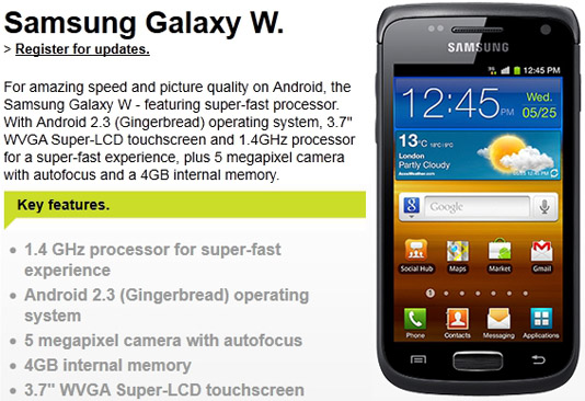 As a reminder, the Galaxy W is a high-end smartphone with a single-core 1.4GHz processor, 3.7-inch S-LCD WVGA touchscreen, 5-megapixel camera on the back, VGA front-facing camera for video calls, HSPA and Wi-Fi connectivity, Bluetooth 3.0, GPS, 4GB of internal memory, memory card slot, while Android 2.3 Gingerbread is running the show. In a nutshell, it’s like a slightly improved version of the original Galaxy S with a smaller screen — Galaxy S comes with a 4-inch display…