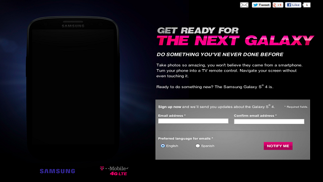 Samsung Galaxy S4 Confirmed For T-Mobile, Pre-Registration Page Goes Live