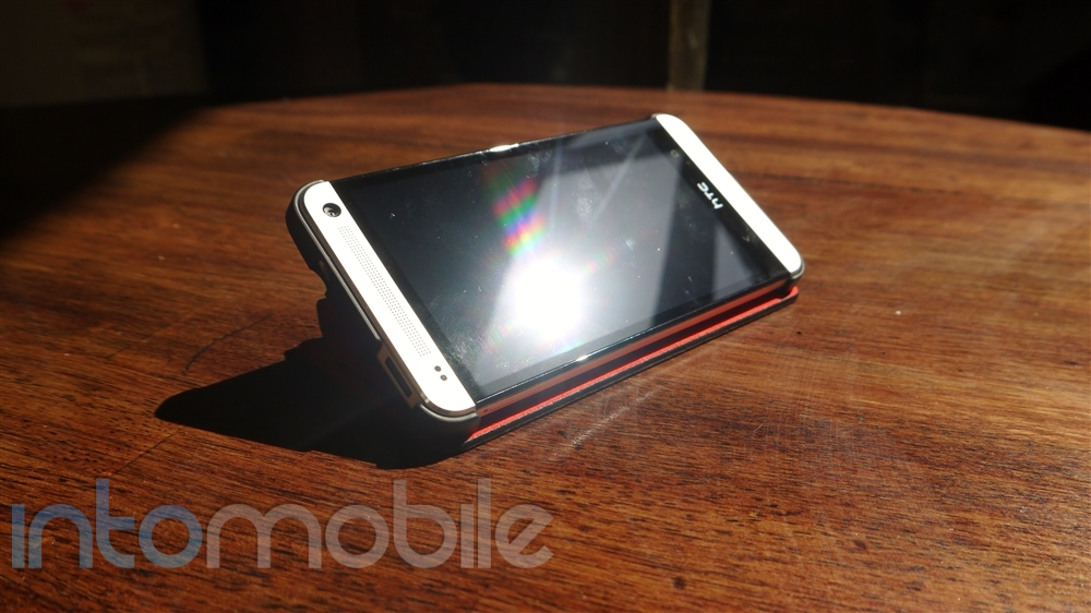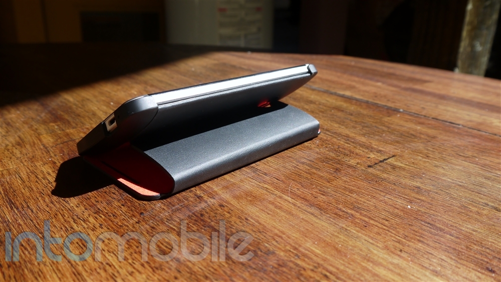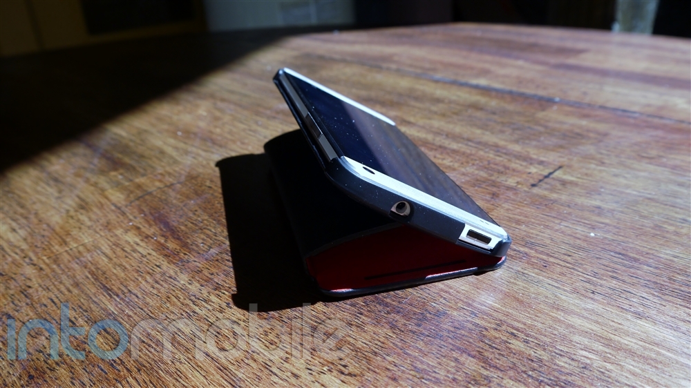 The design of the case is wholly HTC. The outside of the case is black, where the inside is all done up in a red suede. Inside the case is a polycarbonate base that allows for a secure attachment of the device. From there, you can easily tilt the case at an angle to prop your device up for easy video viewing. It’s simple and to the point, and looks slick.