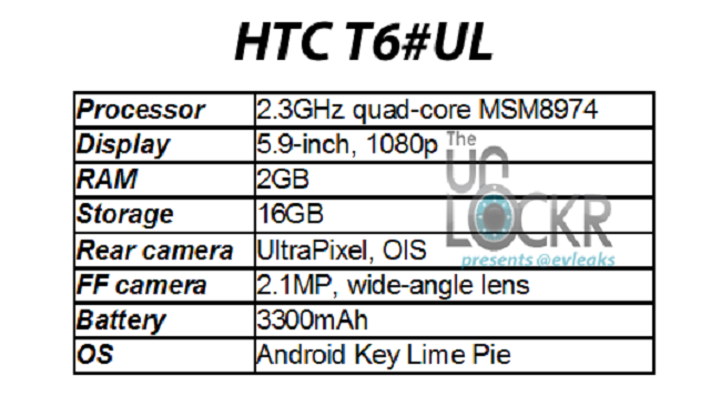 The HTC T6 is rumored to carry on the aesthetic stylings of the HTC One, and will come with a 5.9-inch 1080p full HD display. Powering the phablet will be a quad-core 2.3 GHz Qualcomm Snapdragon 800 processor, and 2 GB of RAM. The device will be sharing the HTC One’s UltraPixel camera and front facing speakers, with the addition of a 2.1 MP optically stabilized, wide-angle front facing camera. Only 16GB of storage will be on board, but a microSD card will allow further memory expansion.