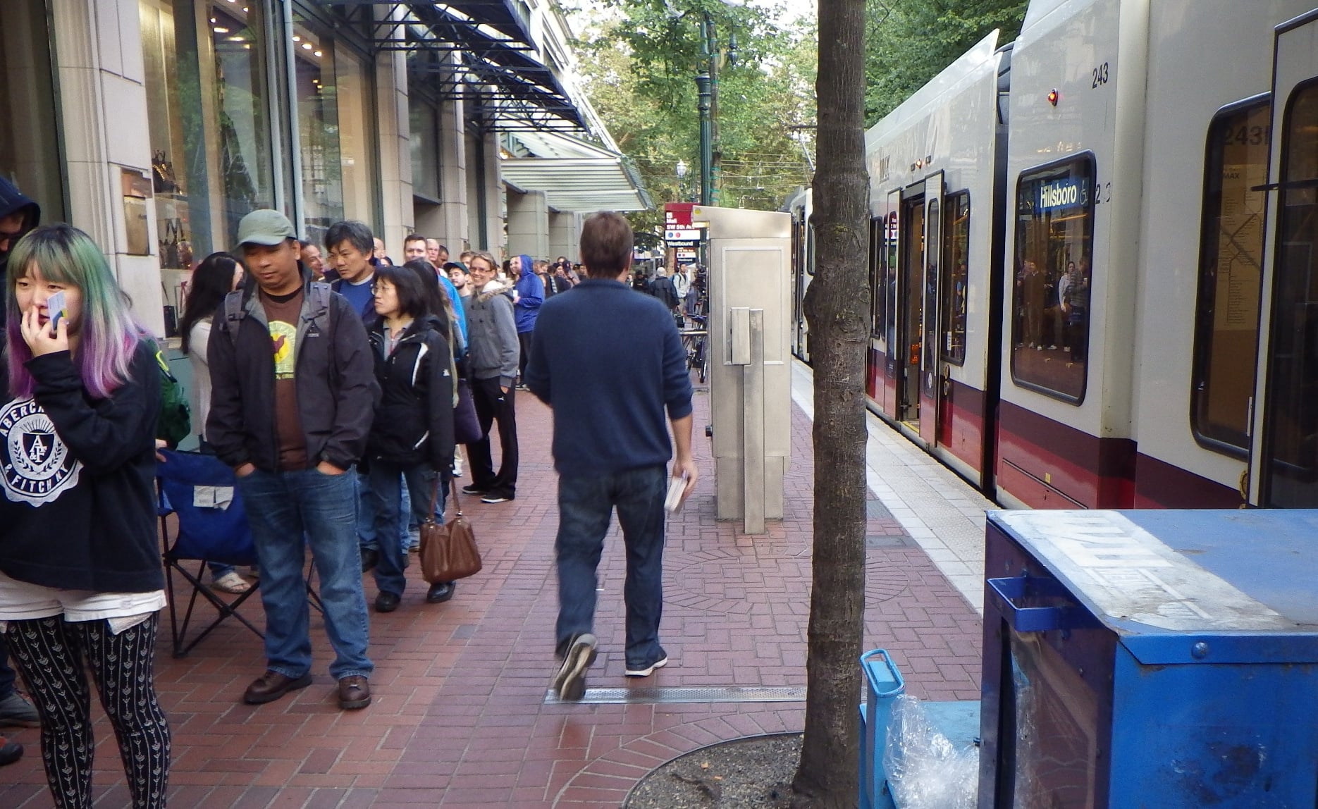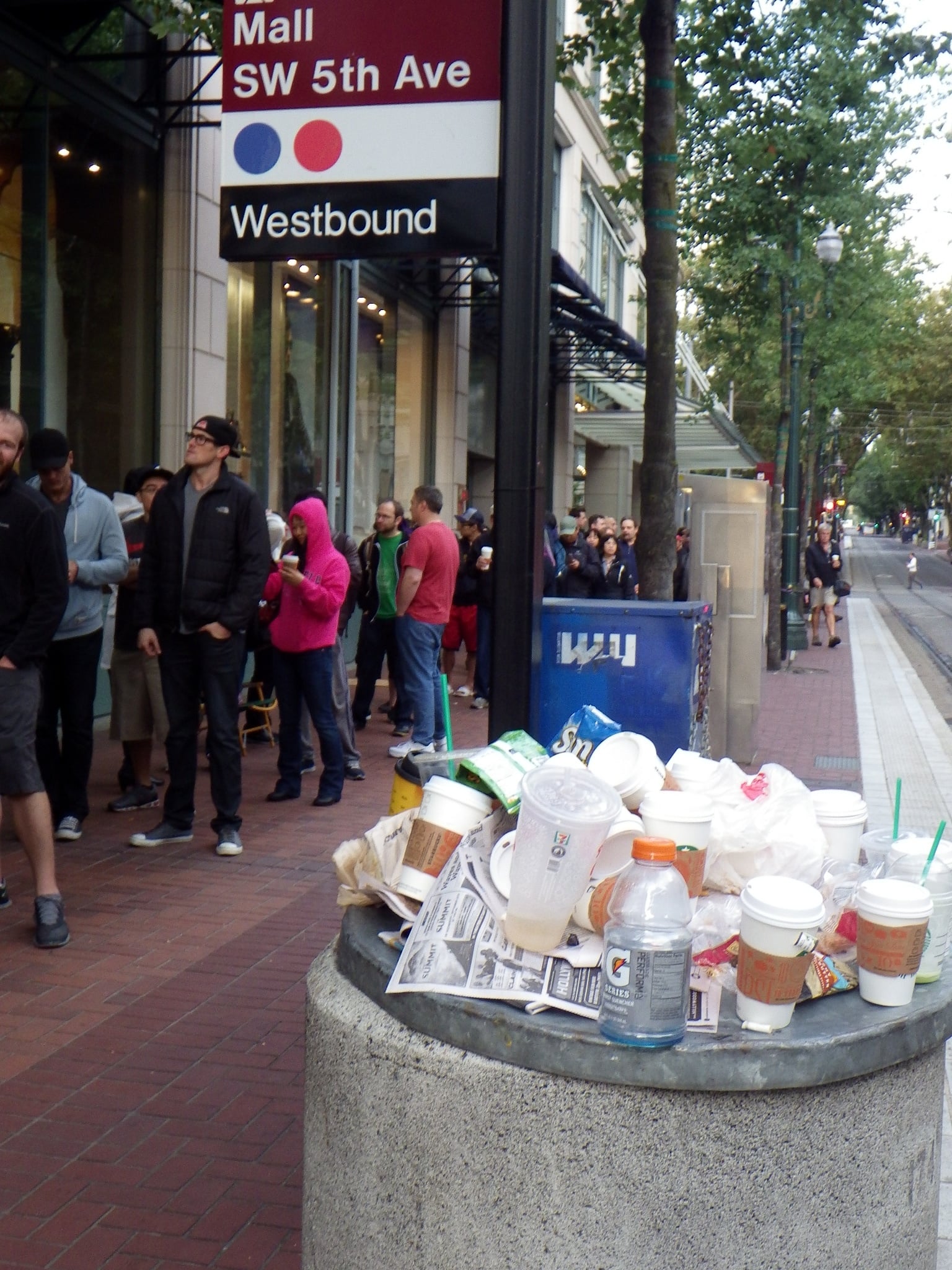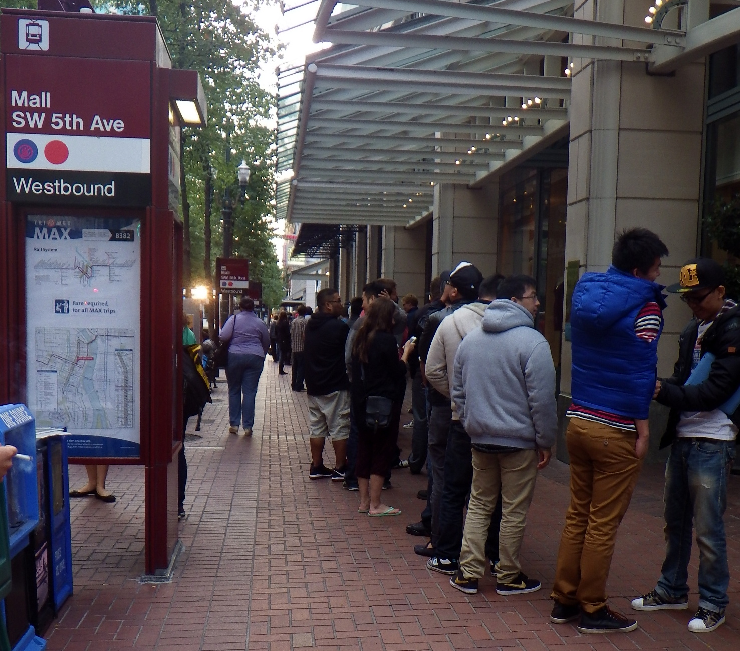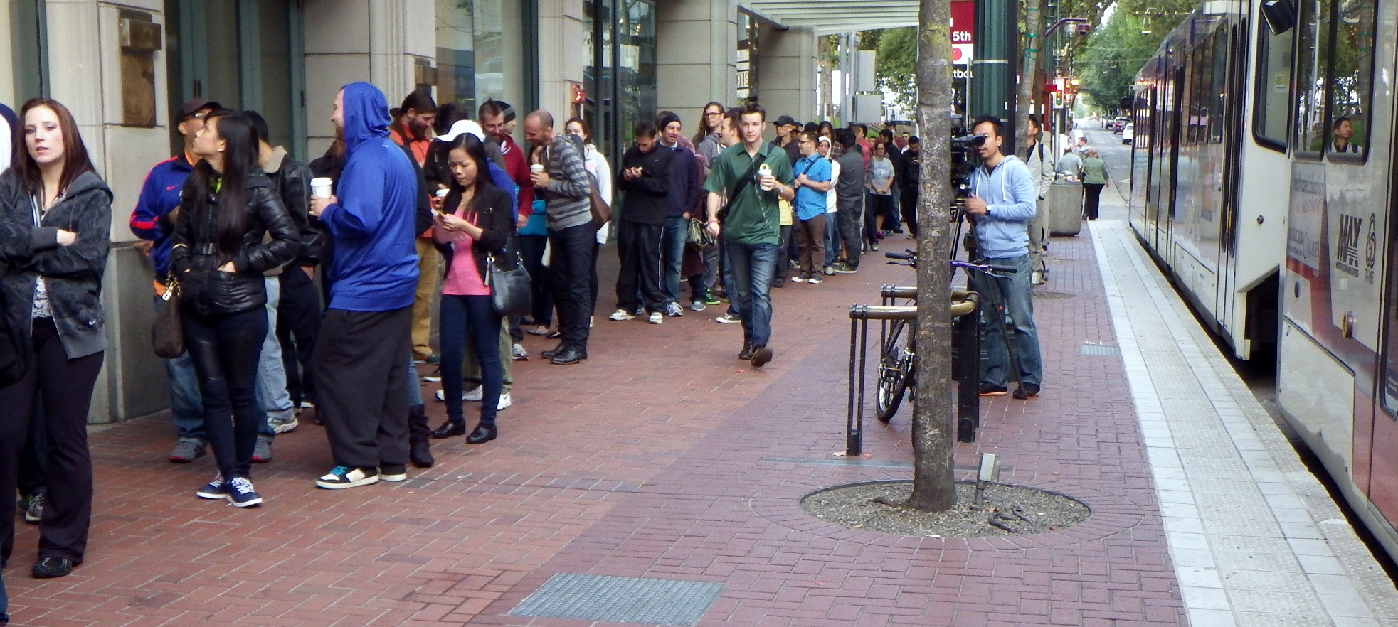 Portland isn’t the biggest city in the country, but there was still a substantial line outside of the Apple store. The store is actually inside of a mall, so everyone was waiting patiently outside for security to escort them, twenty at a time, into the mall to get their hands on the new iPhones. One guy on his way to work stopped next to me, pulled out his Samsung Galaxy S4 and shook his head. “I don’t get it,” he said, “I’ve still got a bigger screen. Who gives a shit about colors, anyway?”