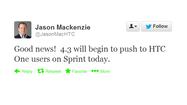 Ok, so the Android 4.3 HTC One update rollout has been a bit confusing, first rolling out in Taiwan, then Canada, and now..the U.S.! Thanks to some reader comments and a tweet from HTC America President Jason Mackenzie, Sprint HTC One owners will be receiving their Android 4.3 treat starting today. That’s a big improvement, jumping from Android 4.1 straight to 4.3. So get ready for some nice surprises.