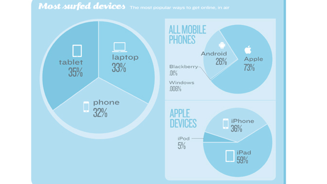 In-flight wireless provider GoGo put together an infographic that details device usage at 36,000 feet. According to its metrics, travelers are more likely to use tablets (35 percent) than laptops (33 percent) or smartphones (32 percent) while flying. A whopping 84 percent of devices used on their service run iOS, while only 16 percent are…