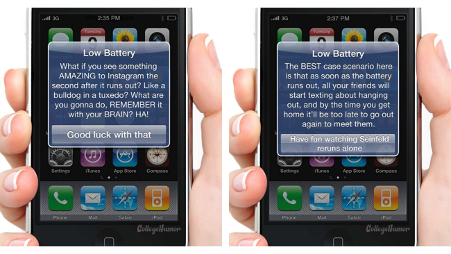 Battery warnings rank right up there as some of the most boring dialogs on earth. How many times have you seen the “20% of battery remaining” alert and just mindlessly tapped it away? Spotted by Gizmodo, College Humor has a great clip showing battery warnings that’ll force you to take notice of the fact that…