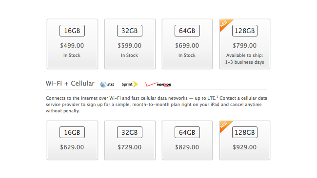 Apple’s 128GB addition to its fourth generation iPad lineup is now available on the company’s website. The super-sized model is available in black or white as well as with WiFi and WiFi+Cellular options. Pricing for the WiFi model starts at $799 and climbs to $929 for WiFi+Cellular. The WiFi model is available to ship within…