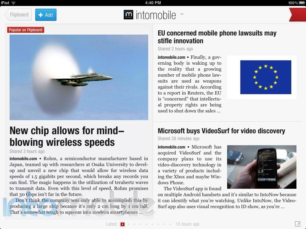 We’re big fans of the Flipboard iPad app because it is a smart take on digital news consumption and it utilizes the tablet very effectively. Well, you’ll be happy to know that IntoMobile is now a featured content partner in the Technology category, so go ahead and add us to get all your mobile needs…
