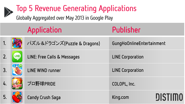 App Analytics company, Distimo release its monthly roundup of mobile app download and revenue data today. It appears that there hasn’t been any major shake ups since last month, as most of the tops slots in are occupied with familiar names. Puzzle & Dragons and Candy Crush Saga are still candy crushing it across the board.…