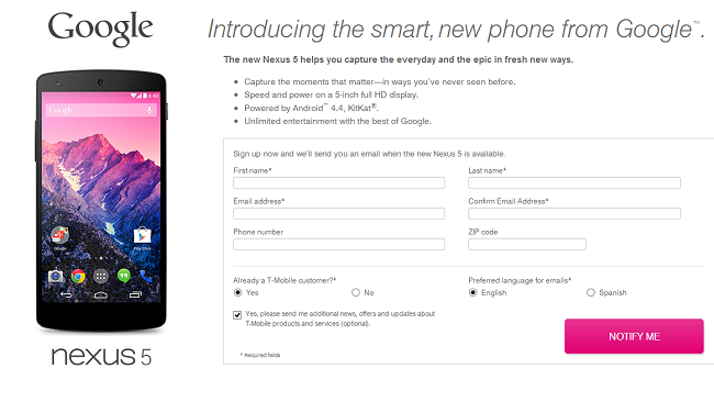 T-Mobile has just announced that it will be offering the upcoming Nexus 5 for a holiday season launch! Pricing and availability for the Nexus 5 have yet to be announced but you can bet that it will be on its way soon! T-Mobile now has a sign-up page for more information for the Nexus 5…