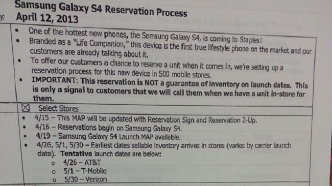 Leaked Document Shows Samsung Galaxy S 4 Availability on AT&T, T-Mobile and Verizon