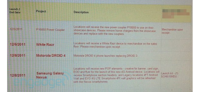 Though it was mentioned yesterday, today there’s even more evidence that points to the Samsung Galaxy Nexus being released on December 9th. The picture you see above not only shows the Galaxy Nexus being released this Friday but the Motorola Droid 4 set to be released on December 8th. With Galaxy Nexus phones already arriving…