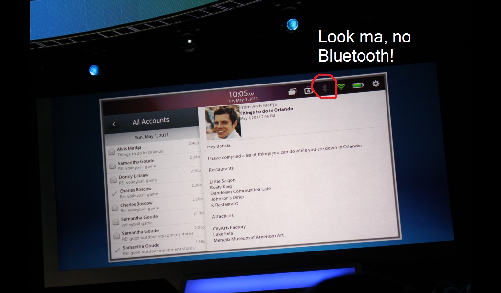 The BlackBerry PlayBook launched with the rather irksome “feature” that required a BlackBerry smartphone to be paired over Bluetooth to get core apps like e-mail, contacts, memos, and tasks. RIM has been promising that stand-alone versions would be available, and today at their big conference, they showed e-mail and contacts running fine without a Bluetooth…