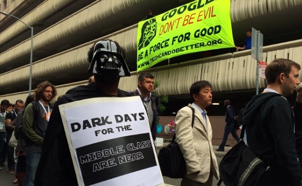 Google I/O was disrupted by a many protesters today at the Google I/O developer conference in San Francisco. The first disruption came early on in the event, with a woman protesting Jack Halprin, a part of Google’s legal team. The Woman yelled, “Google is evicting me from my house… Jack Halprin is a millionaire… He…