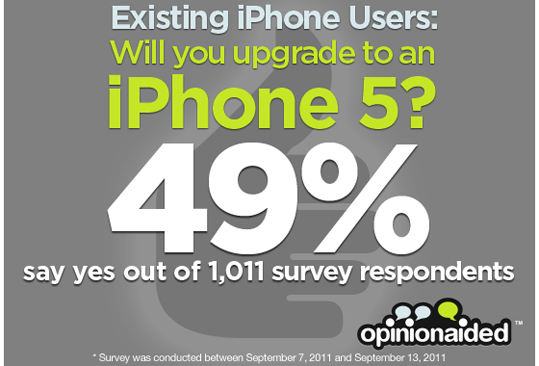 Mobile Q&A company Opinionaided conducted a small survey between September 7, 2011 and September 13, 2011, asking its iPhone users whether they’ll upgrade to the iPhone 5. 1,011 people responded, with 49% of them saying “I do.” 😉 Of course, we shouldn’t make general judgments from such a low sample. Then again, let’s play with…
