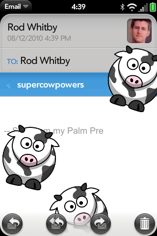 It’s nice to see that despite Palm’s sad market share they still have a sense of humour. Anyone with a webOS 2.0 phone will see spheroid bovines fill their screen if they receive an e-mail with the subject line “supercowpowers”. It’s probably just some convoluted inside joke at Palm, but it’s kind of nice that…