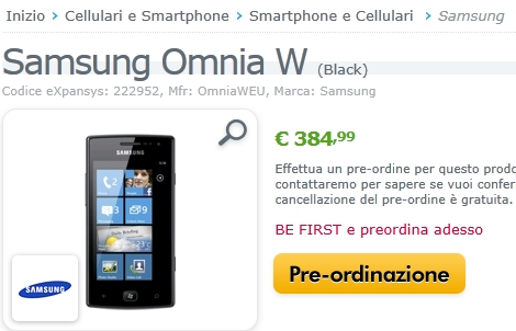Samsung Omnia W available for pre-order in Italy for 385 EUR